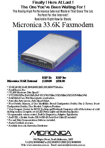 | Brand | MICRONICA Jumbuck | NetComm Roadster 336 | Dynalink Fastdesk+ | NetComm Smartmodem 336D | NetComm Voicemaster 336 | Xlink XL-288E V.34+ | US Robotics Sportster Voice 33.6 | Banksia MyFastModem 33.6 | SupraFax Modem | SimpleModem 336F V.34 |