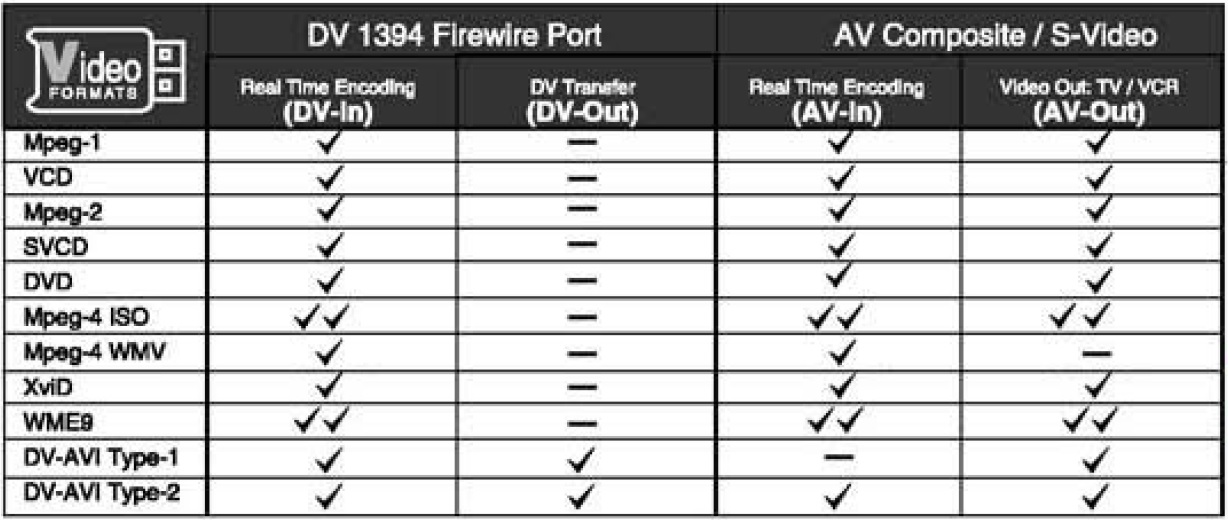 * Inputs: YUV Component Video, Composite Video, S-Video and Stereo Audio inputs * Studio Quality Real-time Hardware Encoding in MPEG-1 and MPEG-2 * Supports MPEG-1 VCD and MPEG-2 DVD (MP@ML) Full D1 and I-frame up to 15 mbps with CBR/VBR compression to meet professional and Non Linear Editing need with guaranteed A/V sync * Advanced 5-line adaptive COMB filter and Anti-Alias filter for video enhancement * Captures DV-AVI, DivX, Xvid, WMV and newly emerging video formats * WHQL compliant, 10 bit ADC * PAL/NTSC/SECAM and VBR/CBR with Programmable GOP * Complete solution. Capture, edit, author and final disk burn VCD and DVD for professional DVD production. * Recording Gallery, Scheduled Recording and Pre-Defined File Size Recording * 5th generation MPEG Hardware Encoder |
