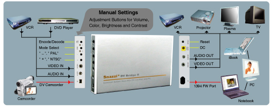 Snazzi* DV.Bridge II * Stand-alone unit. Works with Mac and PC ! * Convert S-Video or Composite Video to DV * Convert DV to Composite Video or S-Video * Captures in Real Time. With stereo audio. * Premium Commercial DV hardware codec guarantees superior quality * Realtime Bi-directional AV to DV and DV to AV conversion * Ideal companion for video editors who want high quality AV to DV conversion * INCLUDES Adobe Premiere Elements video editor software!! * Front Panel Buttons for Volume, Color, Brightness and Contrast * Supports variety of video sources ie. DV, DV-CAM, i-Link, S-VHS, VHS, Hi-8, Video-8 * Preview your edits in realtime on TV from the timeline * Compatible with wide range of iMAC and PC NLE software (eg. Premiere Pro, Final Cut Pro, Media Studio Pro, Movie Maker etc) * Slim and compact for mobility * Suitable for PC and Apple Video Capture and also Apple Mac Video Conferencing * DV Bridge worked well for injection video conferencing equipment into Apple Mac for Ichat.-James (Customer Testimonial) |