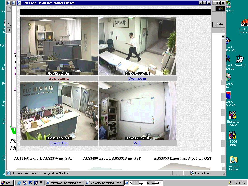 | The VP200 system is a remote video web camera server that provides exceptional streamed video images through the Internet, Intranet, or direct dial-up modem connection via common telephone lines. Up to six video cameras can be hooked up to the unit to deliver high-speed video transmission to anywhere in the world through a desktop PC, workstation, or laptop. All that is needed is an Internet browser and our proprietary software. The system allows users to record live digital video images continuously onto the users' computer hard drive. Attached video cameras can be remotely controlled to swivel and zoom in and out, and the unit can be triggered to initiate certain events through our specialised call-back feature by utilising a telephone connection. | The VP300 remote video plus audio web server supports full motion live 30 fps video footage with its corresponding audio through the Internet, Intranet, or direct dial-up modem connection via common telephone lines. Up to four video signals or cameras can be hooked up to this 19" rack mountable unit to deliver real-time full-motion A/V transmission to anywhere in the world through a desktop PC, workstation, or laptop. All that is needed is an Internet browser and our proprietary software. This system also allows users to record digital video footage continuously onto their own computer hard drive. Attached video cameras can be remotely controlled to swivel and zoom in and out, and the unit can be triggered to initiate certain events through our specialised call-back feature by utilising a telephone connection. VP300 is a complete plug & play stand alone system to get you up and running immediately. Without the need for ongoing maintenance or custom hardware/software configurations. | Simultaneous 30 fps AV broadcasting and recording of video on local TV monitor or remote PC, the newest VP500 Video/Audio Server and DVR Video Recorder supports built-in channel switching (QUAD) function for local CCTV monitoring and can continuously record/save video for 168 hours by cycle recording thereby avoiding disk space shortage issues. Data is stored on the built in Hard Disk and users can query recorded data by date, time, and triggered events via IR remote control or home page. VP500 can record and display video simultaneously. The VP500 Video and Audio Server supports full motion live video footage with its corresponding audio through the Internet, Intranet, or direct dial-up modem connection via common telephone lines. Up to four video signals from cameras or any video source can be hooked up to this 19" rack mountable unit to deliver real-time full-motion A/V transmission to anywhere in the world through a desktop PC, workstation, or laptop. Attached video cameras can be remotely controlled to swivel and zoom in and out, and the unit can be triggered to initiate certain events through our specialised call-back feature by utilising a telephone connection. |